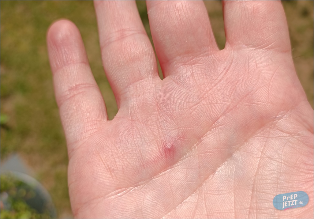 Die Bilder sprechen für sich. Trotzdem noich ein paar Worte für das Tagebuch. Zum Schutz der Pocke in der rechten Handinnenfläche ziehe ich einen Fahrradhandschuh an. Damit sind die Finger offen (angenehm bei dem warmen Wetter), gleichzeitig vermeide ich Berührungen mit Gegenständen und die Pocke selbst erhält nicht zuviel Druck bei den Alltagsarbeiten Zuhause.