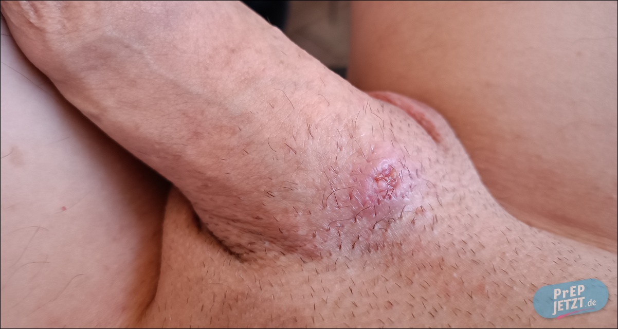 New day and the pox don't even think about getting smaller or disappearing again. But no pain so far. The pocks are sensitive to pressure and the pock on the upper cock root sometimes also radiates a weak pain pulse diagonally to the lymph node, which is clearly enlarged (see 2nd picture starting from the pock diagonally to the upper left).